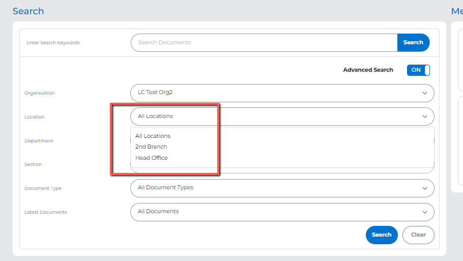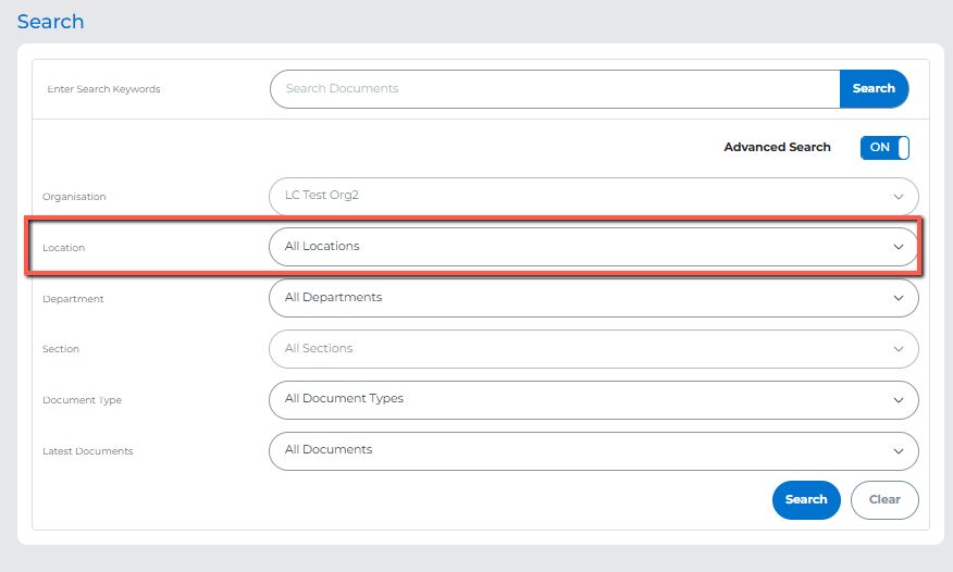 Once added, your new location will appear as a search filter in the document search area. Users can select one or All Locations to refine their search results.