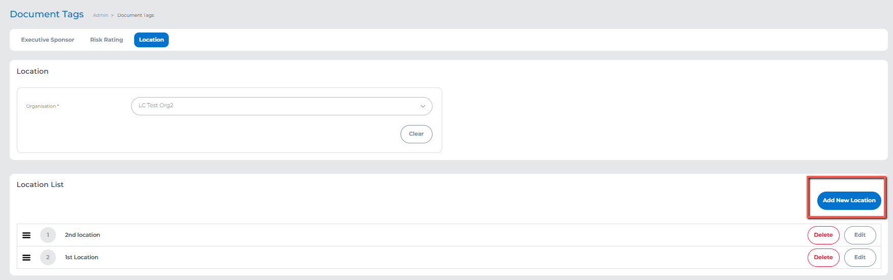 - Go to Admin → Document Tags → Location.